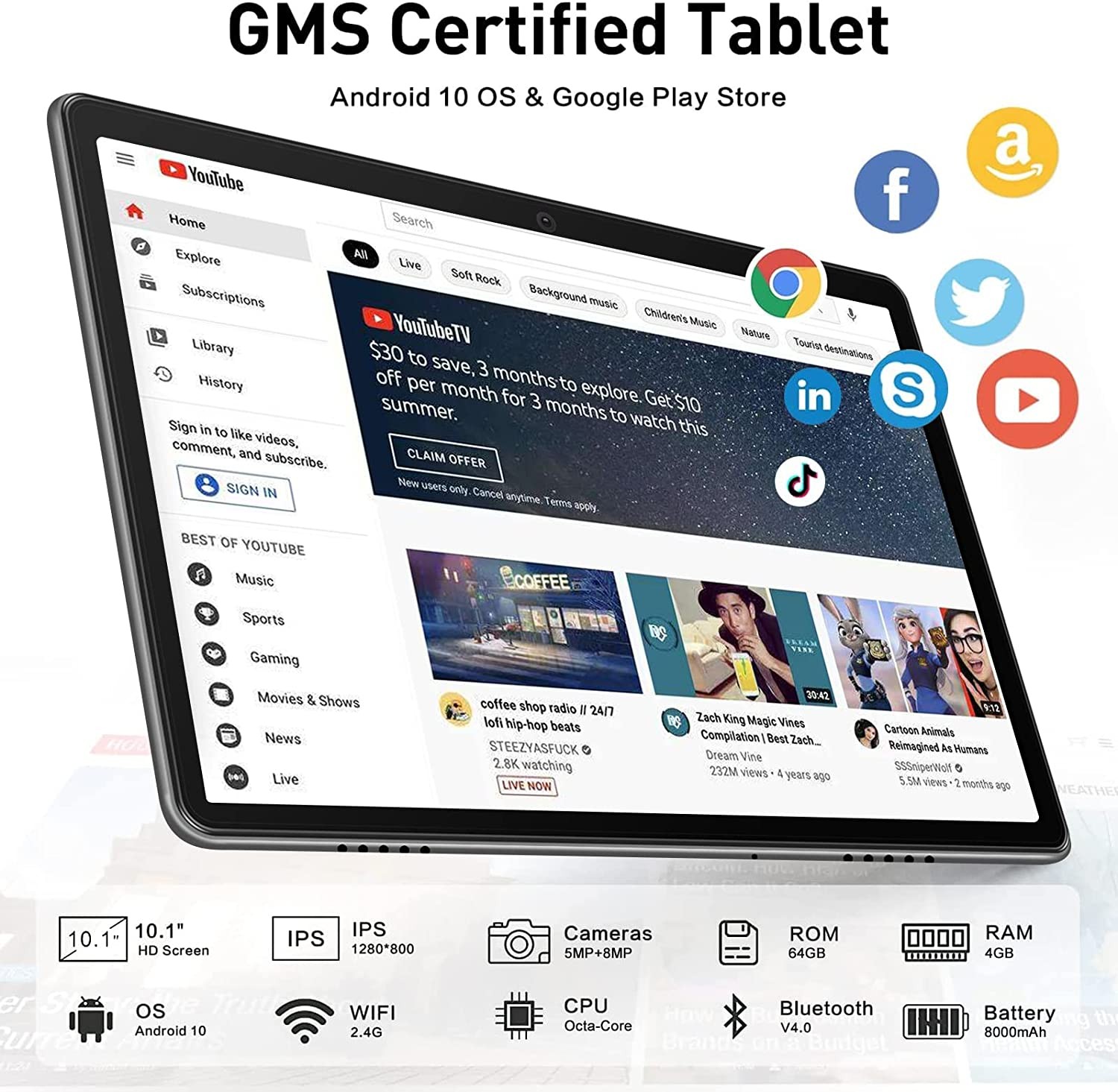 2022 Android Tablet : MEBERRY 10.1 inch Tablets with 4GB RAM+64GB ROM| 256GB Expansion| Octa-Core Processor| Google Certified| 8000mAh Battery| WiFi| GPS| Double Camera, Metal Grey