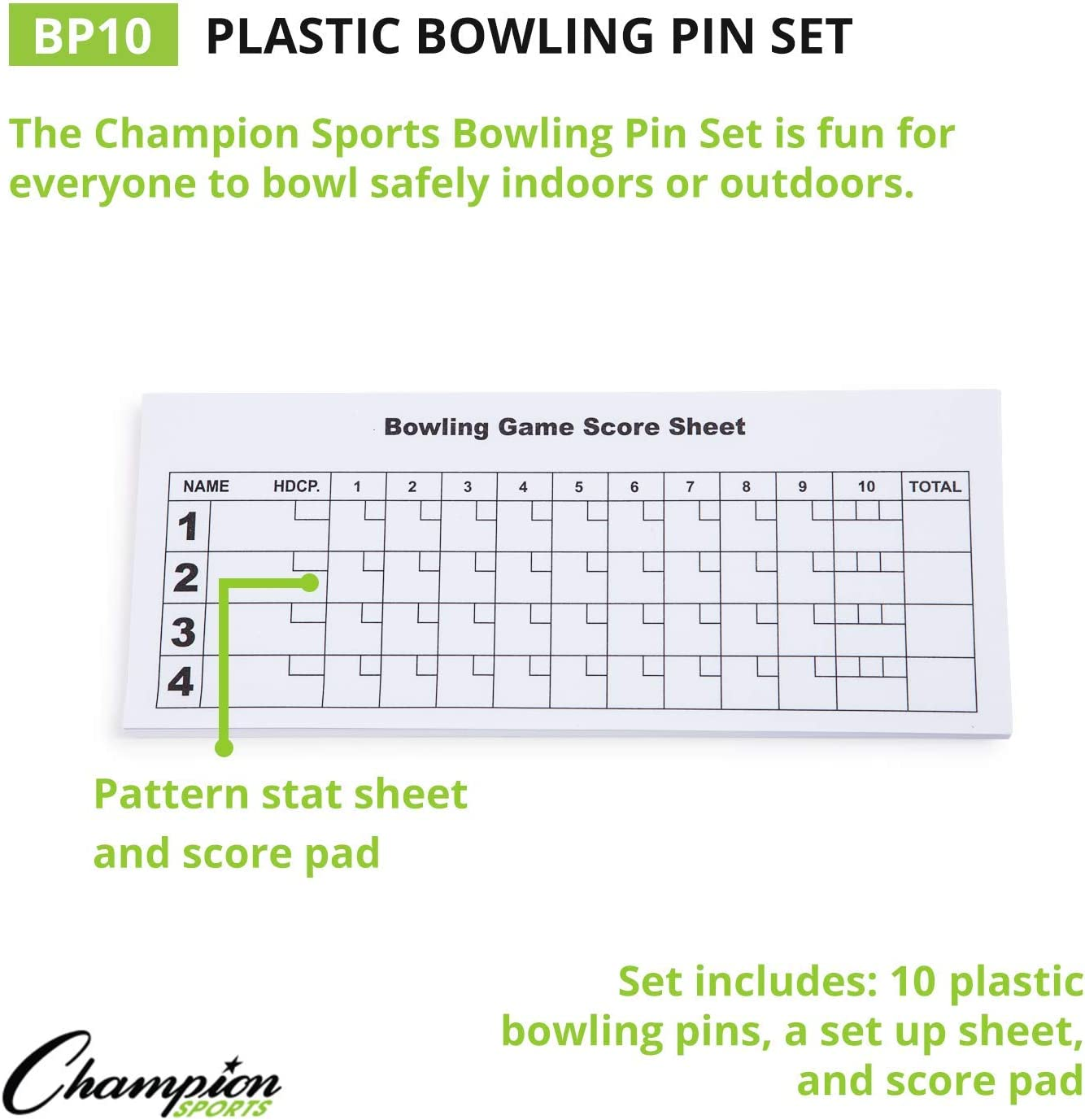 • 10 PIN BOWLING - Champion Sports Plastic Bowling Pin set features ten white pins, the number used by the pros; buy bowling pins and balls for school physical education classes or the recreation room