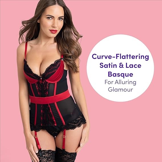 PLASTIC BONING HELPS TO CREATE HOURGLASS CURVES: Cause a stir in the bedroom and between the sheets in this pulse-racingly sexy basque. Achieve the perfect hour-glass figure with cleverly concealed boning and figure-sculpting mesh.
