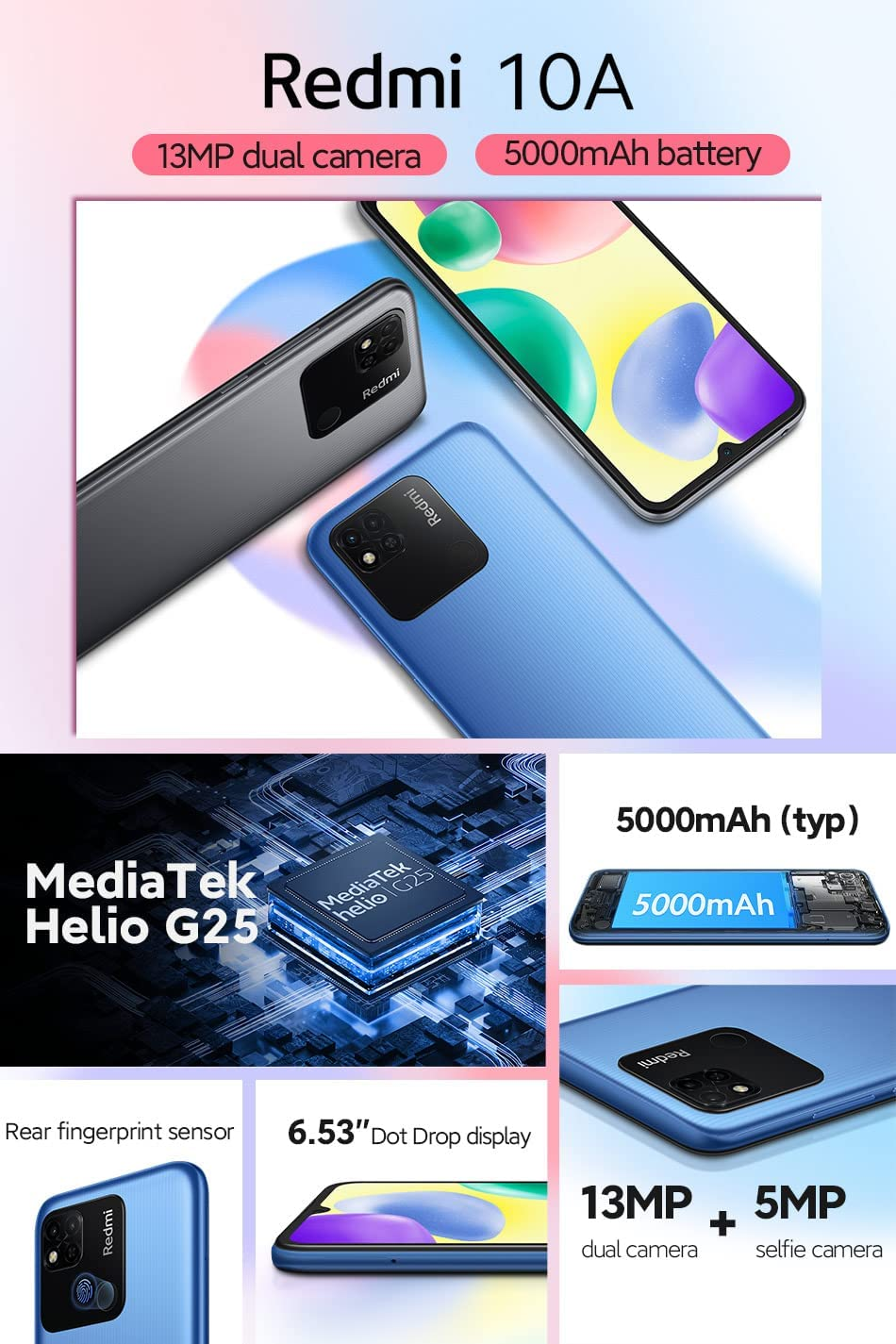 • 【13MP+2MP Dual Rear Camera + 5MP selfie camera】: with Phase detection autofocus, HDR, AI portrait mode, Face recognition, AI beautify 5.0 AI scene detection, Single tone flash, Kaleidoscope effects, Video 1080p, 30fps, 60fps 720p, enjoy an unbeatable visual experience.